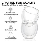 - ELEGANT AND PRACTICAL. Beautiful design with double-walled glass to keep the cup cool to the touch and coffee hot for the soul.