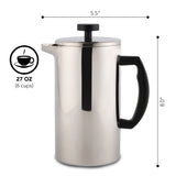 Stainless Steel French Press (KF1020): Classic 27oz French press with a stainless steel body for durability. Features a reusable stainless steel filter and press for a pure brew. Eco-friendly, with no need for pods or filters. Includes an extra filter.