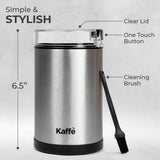 Blade Coffee Grinder (KF2020): Compact 3.5oz grinder for quickly turning whole beans into fresh grounds. Simple on/off button with a safety lid and a transparent cover for monitoring. Multi-purpose for grinding nuts and spices. Comes with a cleaning brush.