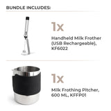 Milk Frothing Pitcher (600ml, KFFP01): Stainless steel pitcher with inside markings for accurate measurements. Designed for smooth micro-foam and easy latte art. Dishwasher safe and includes a 2-year warranty.